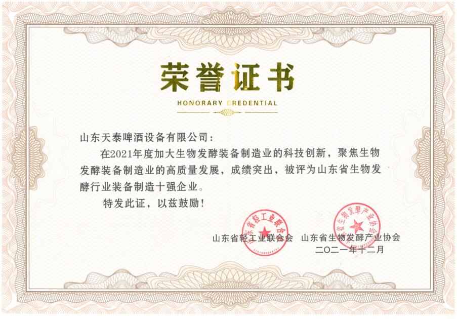 有限公司榮獲2021年“山東省生物發(fā)酵行業(yè)裝備制造十強(qiáng)企業(yè)”的榮譽(yù)稱號(hào)。山東天泰啤酒設(shè)備有限公司(Shandong Tiantai Beer Equipment Co., Ltd)是專業(yè)的啤酒飲料設(shè)備制造商,是啤酒飲料工程項(xiàng)目解決方案提供商和服務(wù)商。公司主要為各類中大型精釀啤酒廠、中型工業(yè)啤酒廠以及科研院所提供全套啤酒生產(chǎn)所需裝備和服務(wù),包括糖化車間裝備、發(fā)酵車間裝備、酵母擴(kuò)培系統(tǒng)、自動(dòng)化控制系統(tǒng)、CIP清洗系統(tǒng)等。同時(shí),公司也生產(chǎn)加工高品質(zhì)果酒設(shè)備、蒸餾設(shè)備和生物發(fā)酵工程設(shè)備等,實(shí)現(xiàn)以發(fā)酵技術(shù)為中心多領(lǐng)域發(fā)展的經(jīng)營(yíng)模式。
